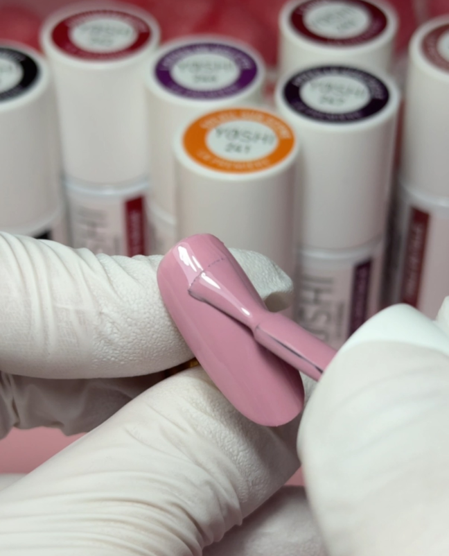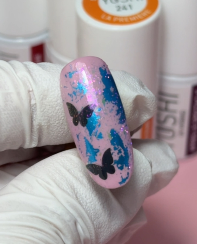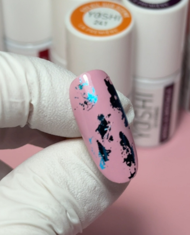Twoją bazą pod zdobienie może być wybrany lakier hybrydowy Yoshi lub baza kolorowa. Ważne, aby miała warstwę inhibicyjną, na której dobrze odbije się folia i naklejki.